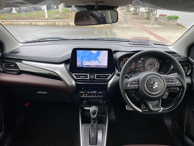 新型フロンクスのインパネには、光沢のあるブラックやシルバーのパネルが使われ、コンパクトSUVながら内装は上質です。メーターも大径で見やすく、エアコンなどのスイッチも操作しやすいです。