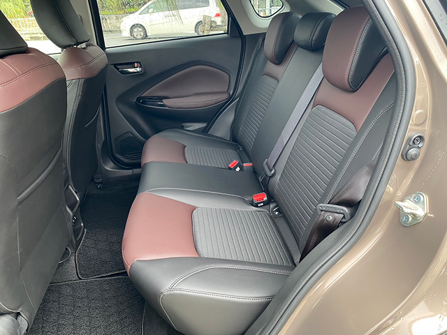 新型フロンクスのボディはコンパクトですが、車内は意外に広いです。身長170cmの大人4名が乗車して、後席に座る乗員の膝先空間は握りコブシ2つ分です。